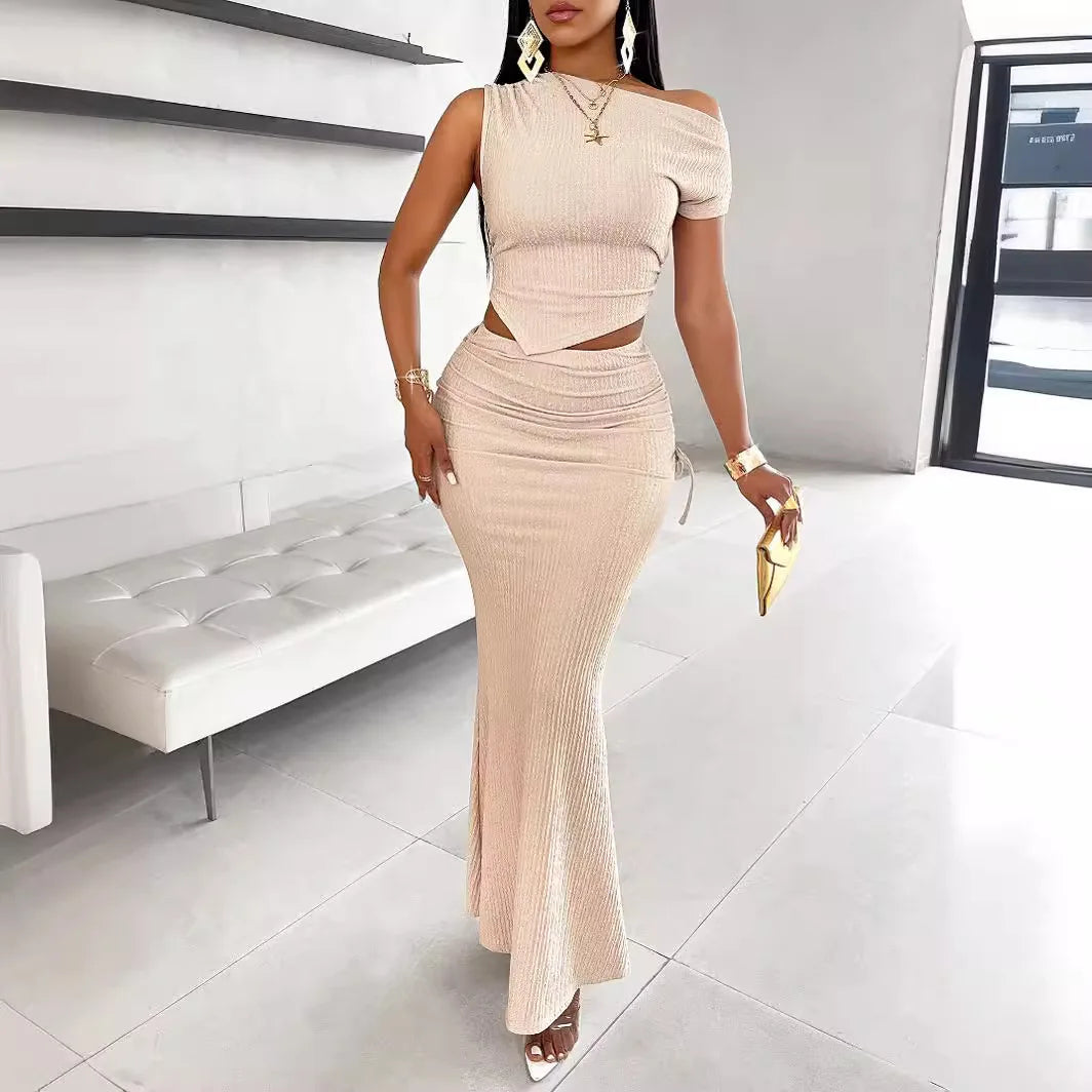 This stunning co-ord set features a figure-hugging ribbed knit fabric designed to accentuate your silhouette with effortless style. The short-sleeve crop top pairs flawlessly with the mermaid-cut maxi skirt, while subtle ruched detailing on the hip adds a touch of flirtatious charm. Whether you're heading out for brunch or a summer evening event, this set promises comfort, confidence, and undeniable allure.